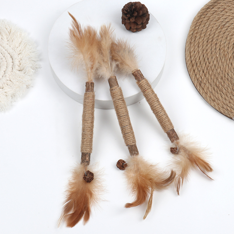 Natural Silvervine Cat Toy with Feather | Catnip Wood Stick Wrapped with Jute Rope
